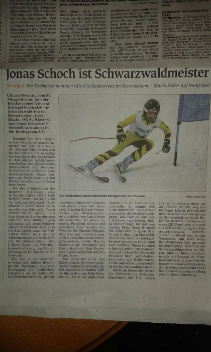 Bei den Schwarzwaldmeisterschaften behaupteten sich Annika Naß und Damian Hohn gegen die Schwarzwälder Konkurrenz. Beim Riesenslalom kam Damian Hohn in der Klasse U14 auf Platz 13 ins Ziel, Annika Naß erreichte in der Klasse U16 Rang 9. Noch besser lief es am Sonntag, als mit dem Slalom die Lieblingsdisziplin auf dem Programm stand. Damian Hohn, nach dem ersten Durchgang noch auf Rang 2, musste im zweiten Lauf nach einem Fehler das anvisierte Topergebnis abschreiben, landete aber immer noch auf dem guten achten Platz. Besser unterwegs war in der Endabrechnung Annika Naß, die aber leider das Podest knapp verpasste und mit Rang 4 vorliebnehmen musste.
